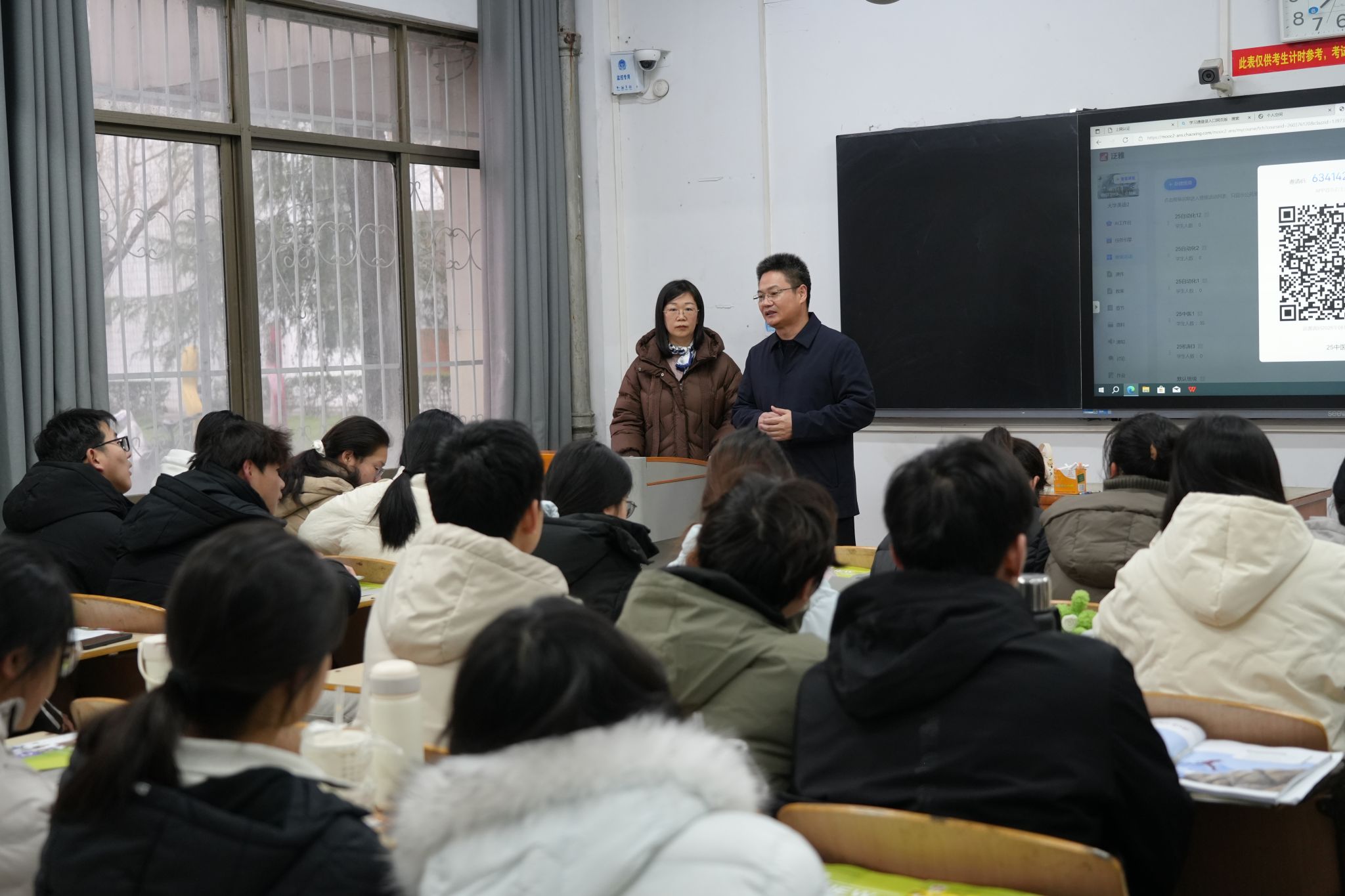 在大学英语课堂,校领导叮嘱教师紧扣审核评估整改方案,持续推进教学改进;勉励学生珍惜大学时光,夯实英语基础,大学期间争取通过大学英语六级考试,以扎实学识和综合能力服务国家建设。
