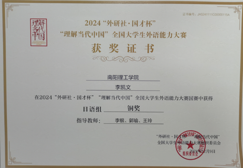 太阳集团tyc151cc日语专业22级李凯文同学获国赛铜奖和省赛特等奖,21级日语2班卫彤同学和22级日语程树阳同学获省赛一等奖,21级日语1班张素茹同学获省赛三等奖。