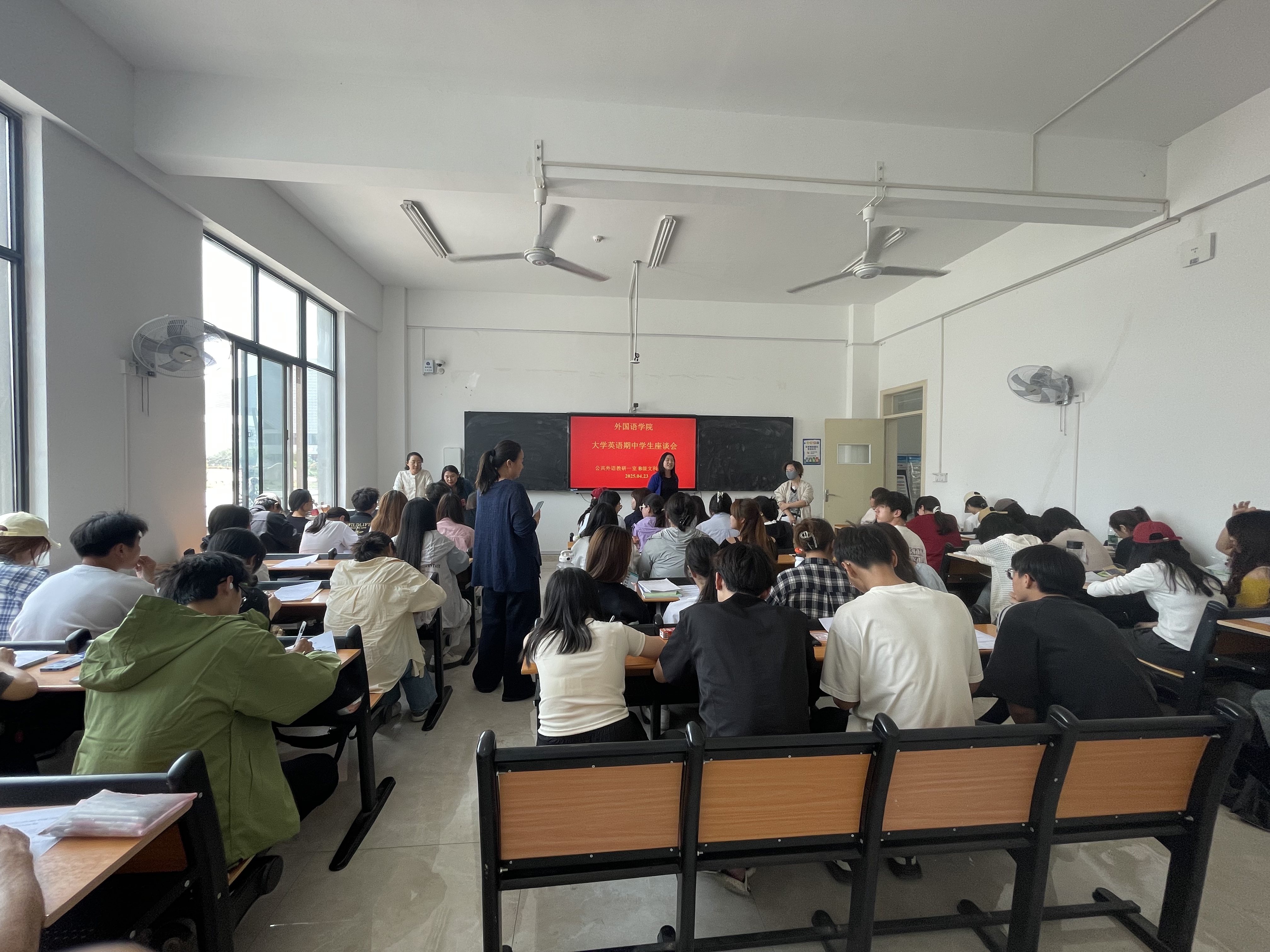 本网讯(通讯员/雷志平 宋歌)为全面诊断大学英语教学实效,精准提升人才培养质量,4月23日中午,公共外语教研一室按课程组分别召开期中学生座谈会,听取了2024级理工类、文科类及中外合作办学等专业学生代表的教学反馈。各课程组负责人主持座谈,教研室骨干教师全程与会。