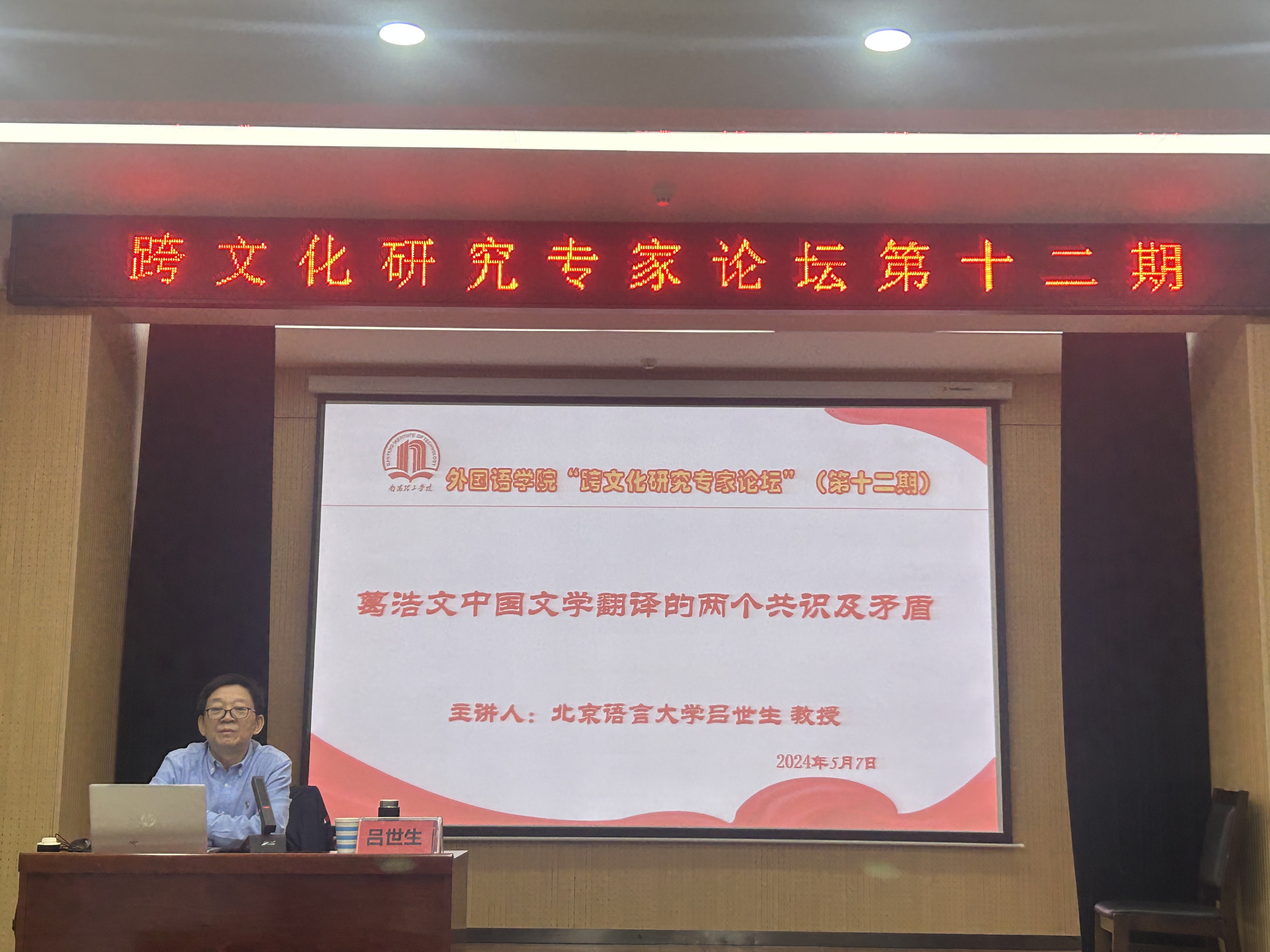 本网讯(通讯员/周小玲)2024年5月7日下午,太阳集团tyc151cc在19105会议室召开第十二期“跨文化研究专家论坛”。本次讲座聚焦文学翻译与文化差异,邀请了知名学者北京语言大学吕世生教授作为主讲嘉宾,会议由副院长包相玲主持,太阳集团tyc151cc院长赵万哲、副院长李秋芳及全体教师参加。