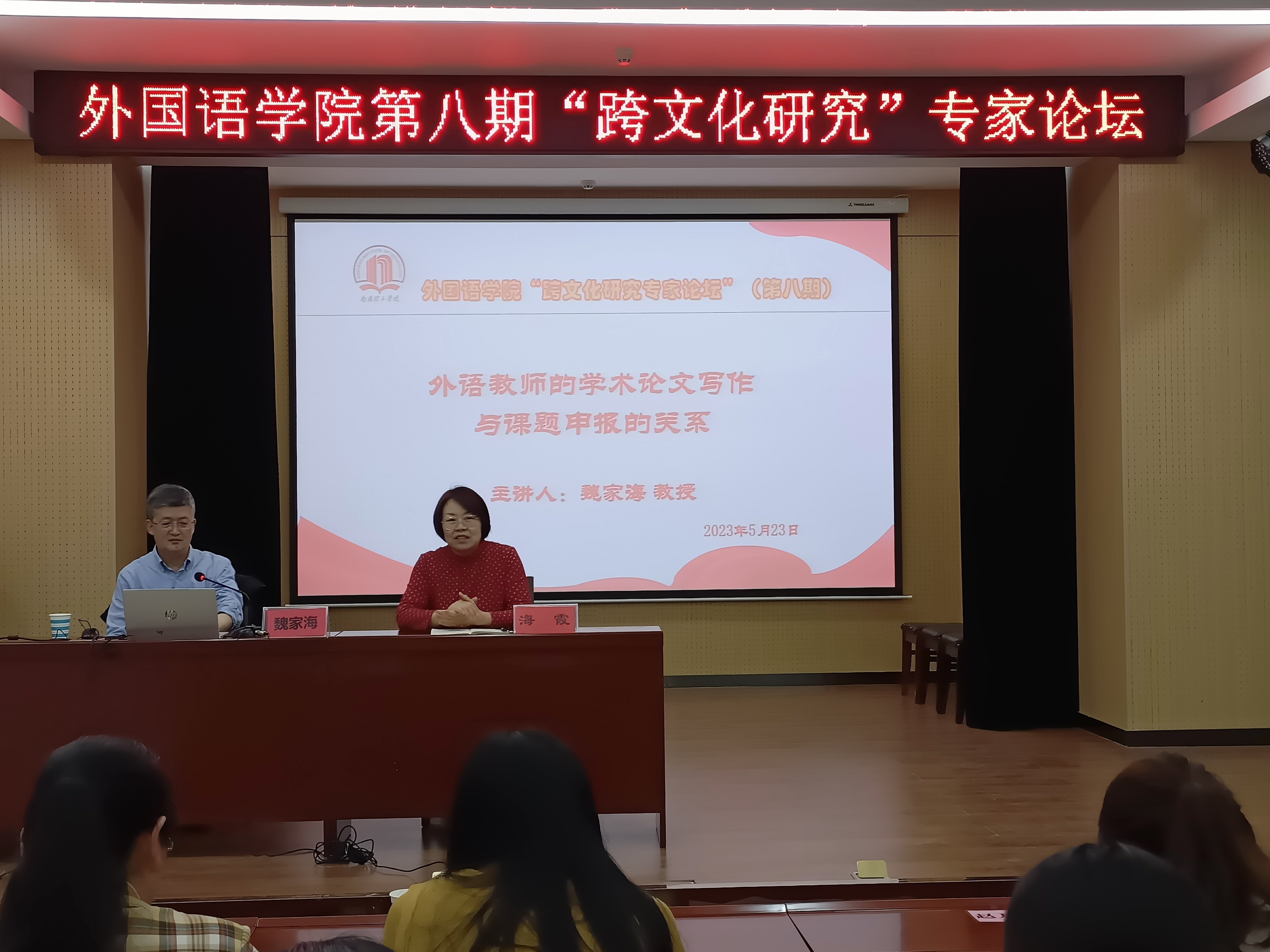 本网讯(特约记者/周小玲2023年5月23日下午,太阳集团tyc151cc邀请华中师范大学太阳集团tyc151cc博士生导师魏家海教授为全院教师开展一场题为“外语教师的学术论文写作与课题申报的关系”的精彩讲座。讲座由院长海霞主持,太阳集团tyc151cc副院长包相玲、李秋芳、张亚楠及全体教师参加了此次论坛。