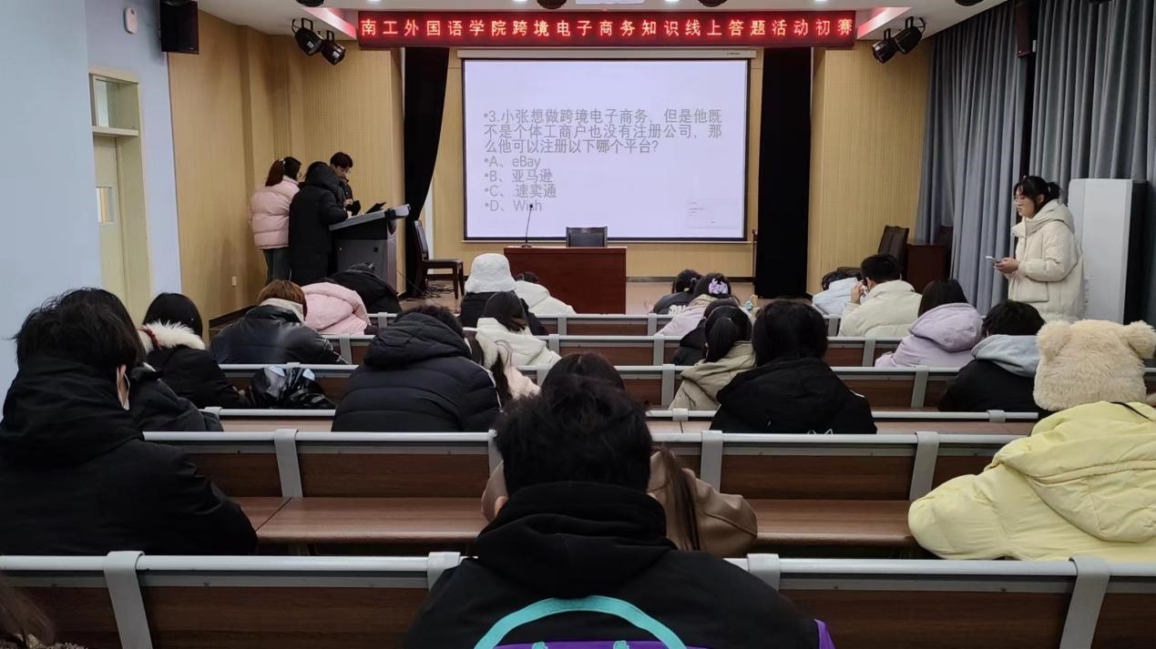 本次活动分为三个部分,着重考察同学们对于跨境电子商务行业的认识。活动开始前,参赛同学登录微信,完成个人信息填写。参赛同学们被分为不同的小组,采用线上选题的形式,小组成员们获取题目之后选择起立回答,答对即可为自己所在的小组加分。活动过程中,所有参赛同学积极抢答,活动现场气氛活跃。为保证比赛的公平公正,组织人员参与监督。答题活动结束后,同学们有序退场,赛后评委们根据比赛分数评出优胜者,本次活动圆满结束。