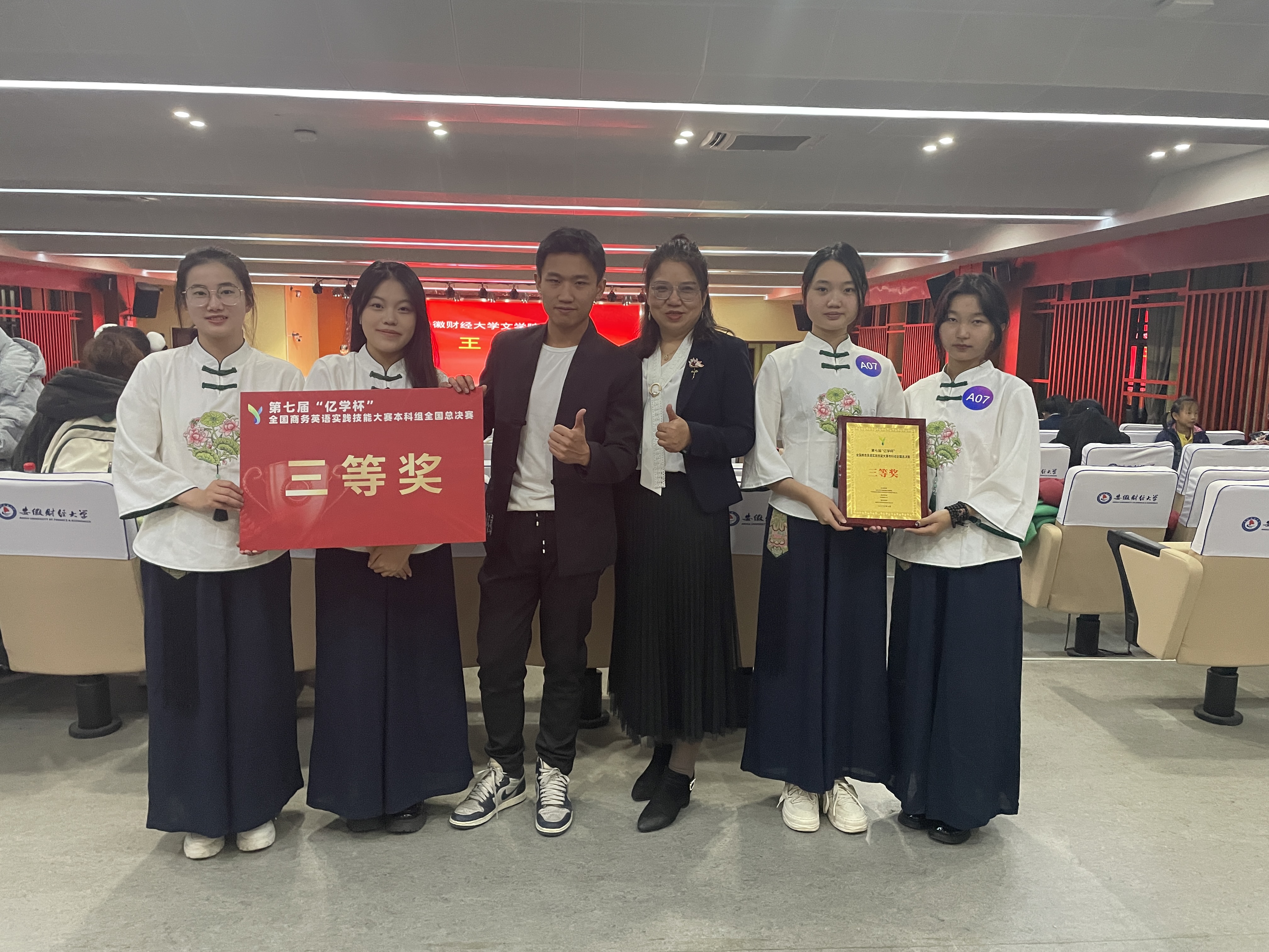 本网讯(通讯员/杨彦丽)2023年11月24-26日,第七届“亿学杯”全国商务英语实践技能大赛本科组全国总决赛在有“珍珠城”美誉之称的淮河流域中心城市蚌埠市的安徽财经大学龙湖校区成功举办,太阳tyc151cc杨彦丽老师带领陈嘉朋、叶平威、谢婧玲、李超越和岳超英5位同学参加了全国总决赛,并在决赛中荣获三等奖。