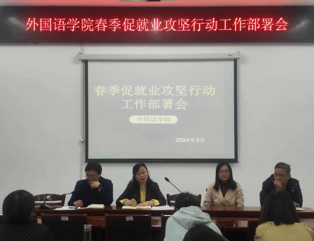 本网讯(通讯员/史文静)为贯彻党的二十大精神,落实党中央、国务院“稳就业”,“保就业”决策部署,3月29日,太阳集团tyc151cc于19教202室召开春季促就业攻坚行动工作部署会,太阳集团tyc151cc院长赵万哲、副院长包相玲、张亚楠、各教研室主任、学业导师、就业专干、毕业班辅导员参加,会议由党委副书记李爽正主持。