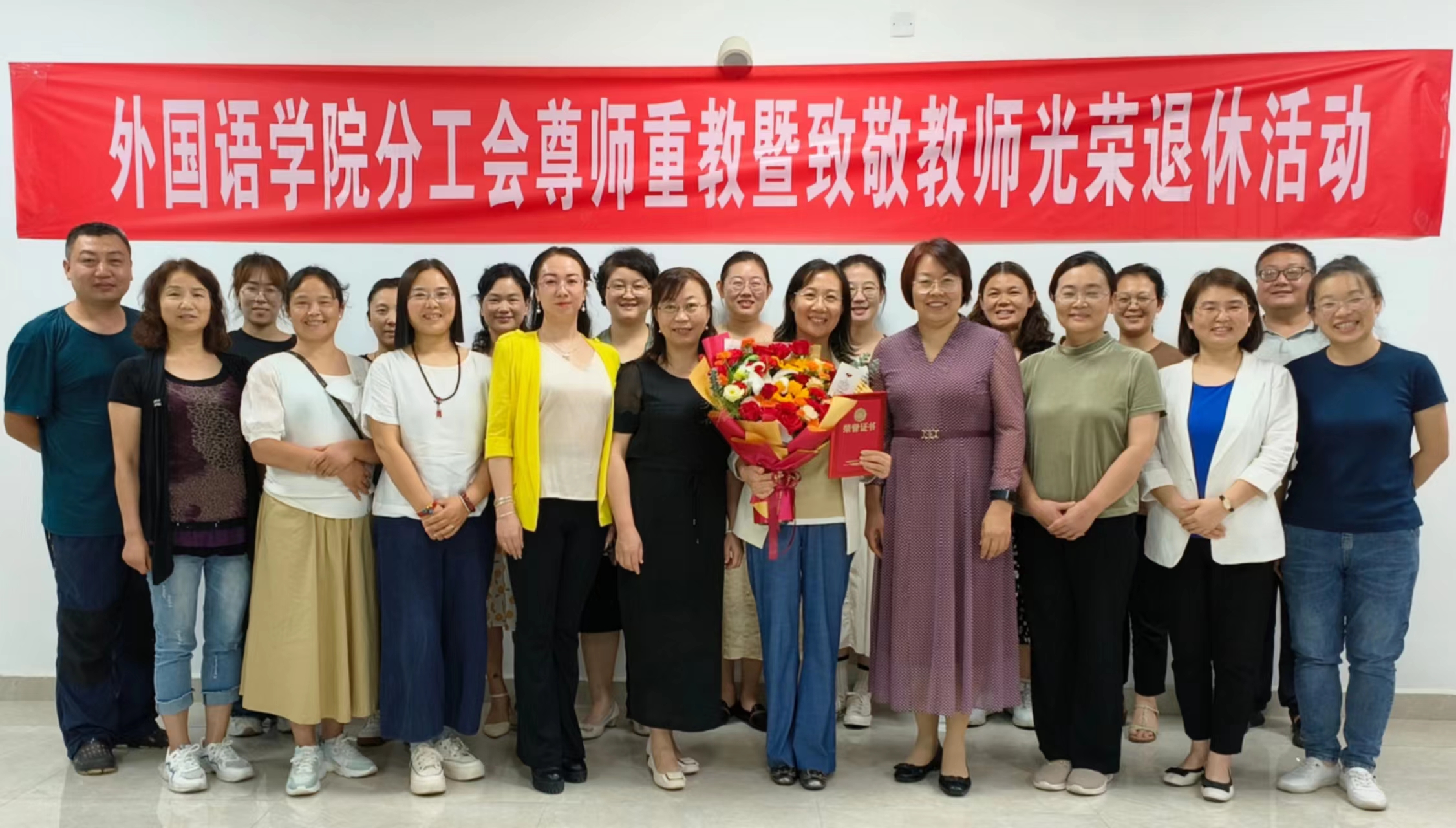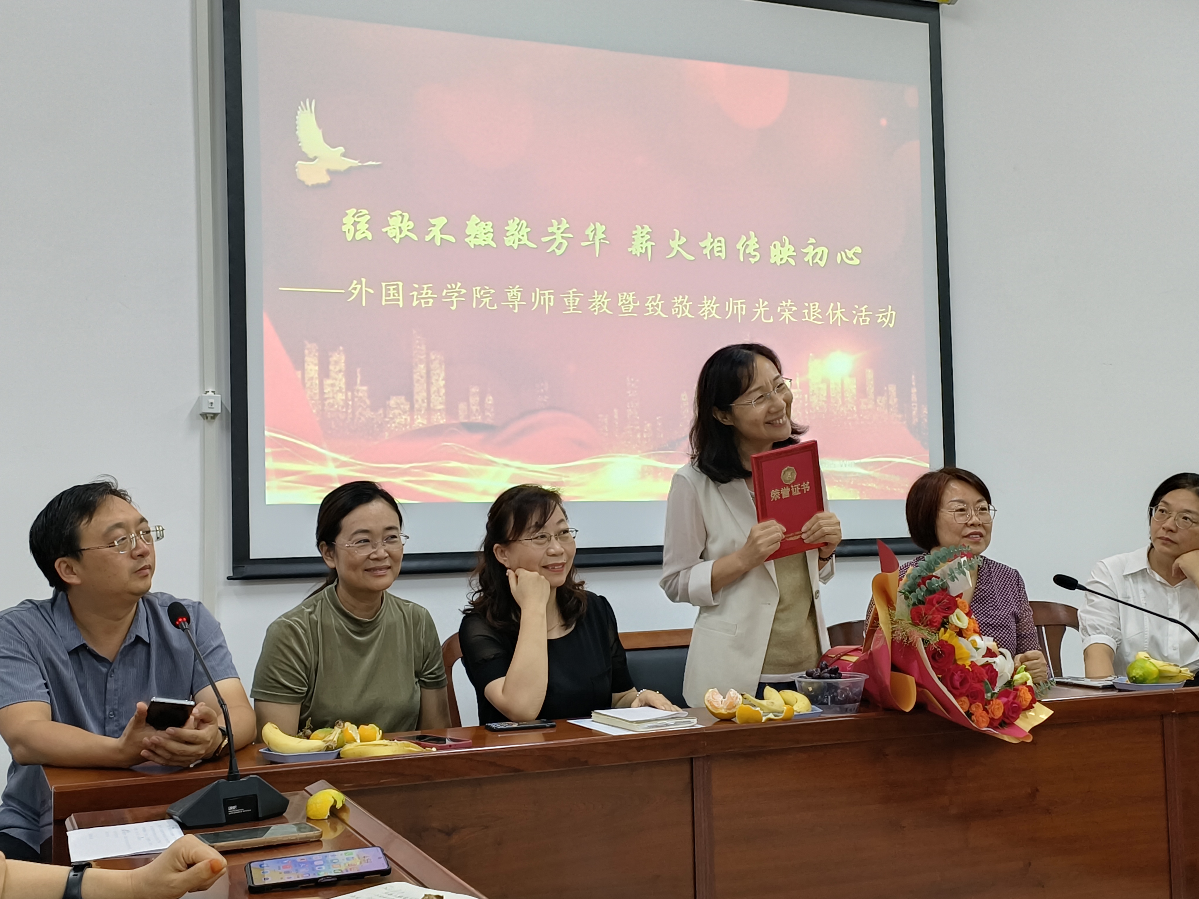 弦歌不辍敬芳华,薪火相传映初心。分工会为刘英爽教授颁发了“光荣退休”荣誉证书,肯定了她坚守教育初心,以德为首,以爱育人的教师生涯。教师们也为刘英爽教授献鲜花、说祝福,表达了对她最诚挚的敬意,并纷纷表示要传承“薪火相传”的教育精神,倾情教育事业,为学院高质量发展做出贡献。(校对:孙卫萍,审核:李爽正)