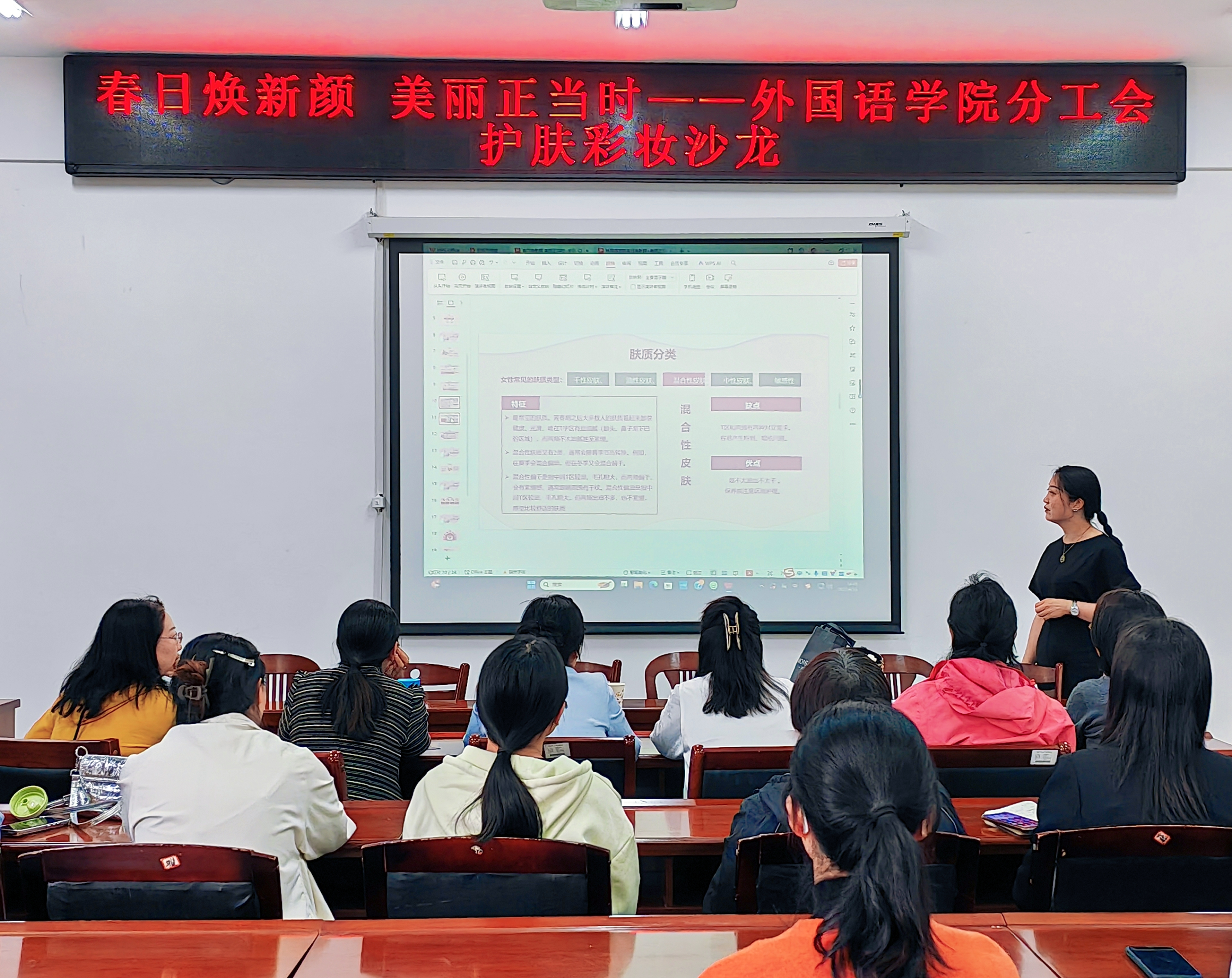 活动伊始,主讲老师橘子通过精心准备的PPT,以生动形象的方式,从皮肤基础护理知识讲起,详细介绍了不同肤质的特点及对应的护肤方法。随后,老师围绕日常通勤彩妆,深入浅出地讲解了上妆步骤,涵盖底妆、眼妆、腮红、唇妆等,为大家普及了日常护肤及彩妆技巧。