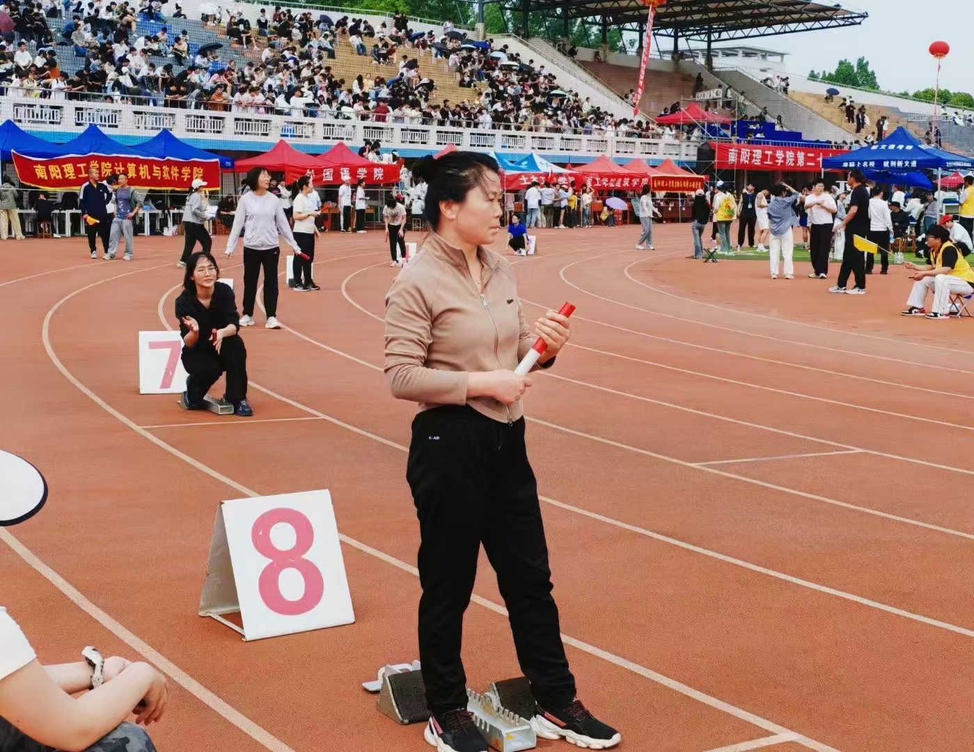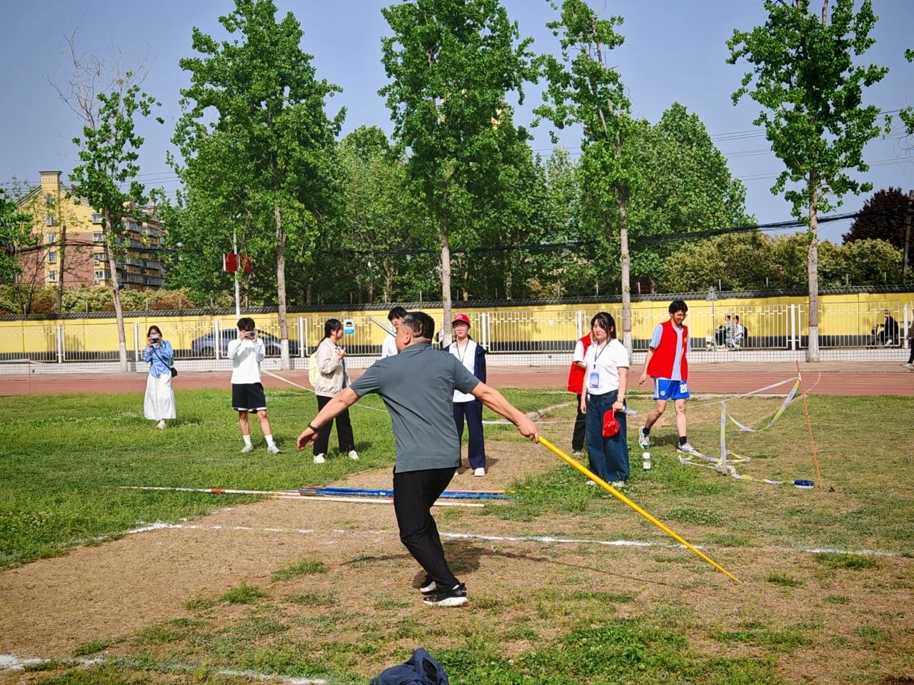 来到教工男子青年组标枪的比赛现场,刘印老师以稳健的助跑和精准的投掷技术,取得了第七名的成绩。刘印老师经常利用自己的课余时间反复练习动作要领,他的坚持不懈最终得到了回报。在教工青年女子组4*100接力的比赛中,由李康、宁会勤、徐伊杨、王韵斐四位老师组成的接力队默契配合、全力冲刺,最终以第六名的成绩冲过终点线。从起跑的果敢到接棒的流畅,再到最后一棒的全力冲刺,她们用行动证明了团结就是力量。
