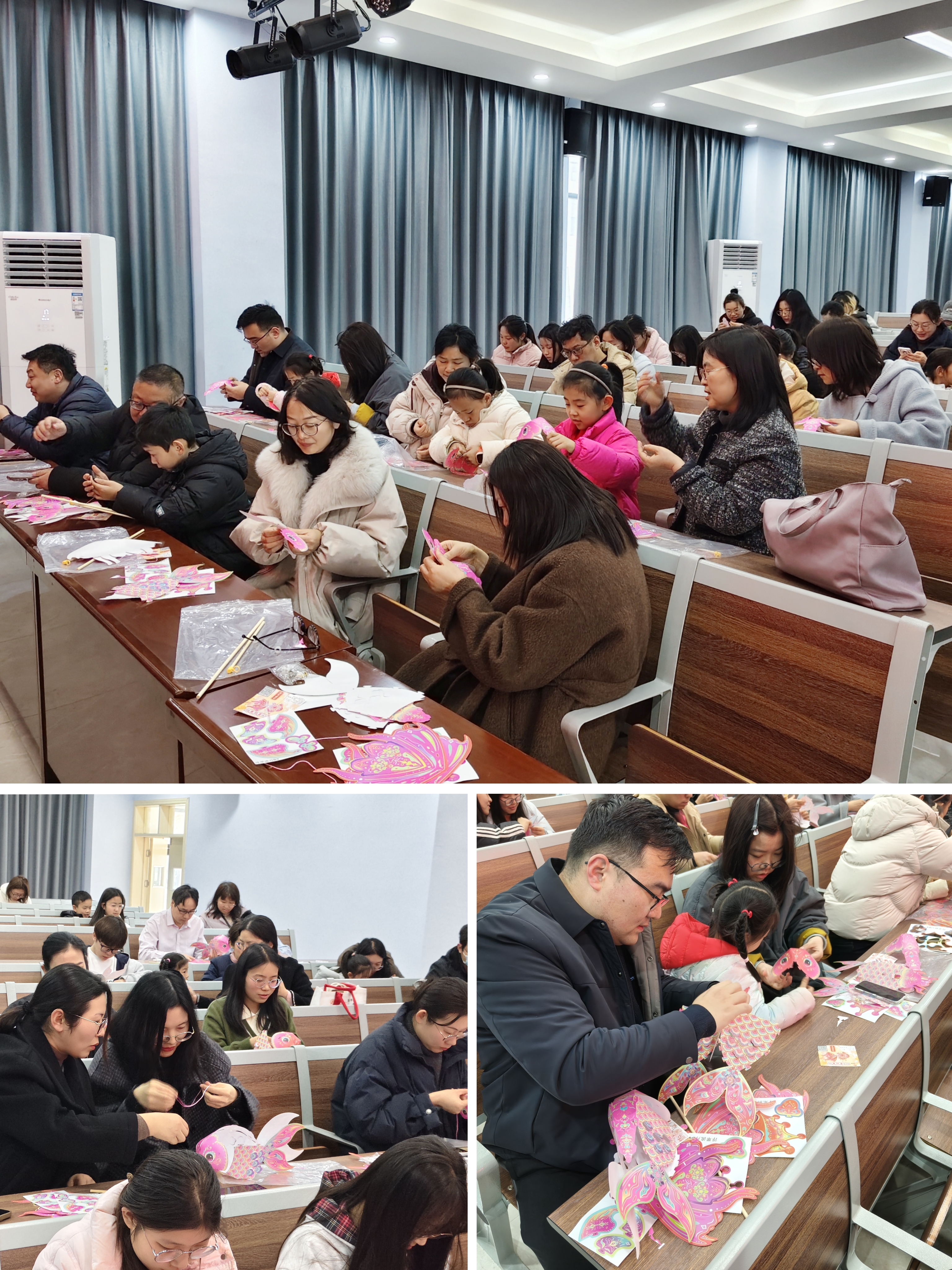 活动伊始,指导老师细致讲解制作步骤,师生们认真聆听讲解后便投入创作:裁剪、拼接、调整锦鲤灯笼的鳞片位置、安装彩灯,每一步都细致专注。